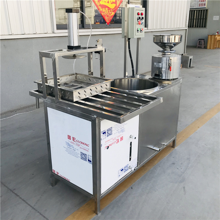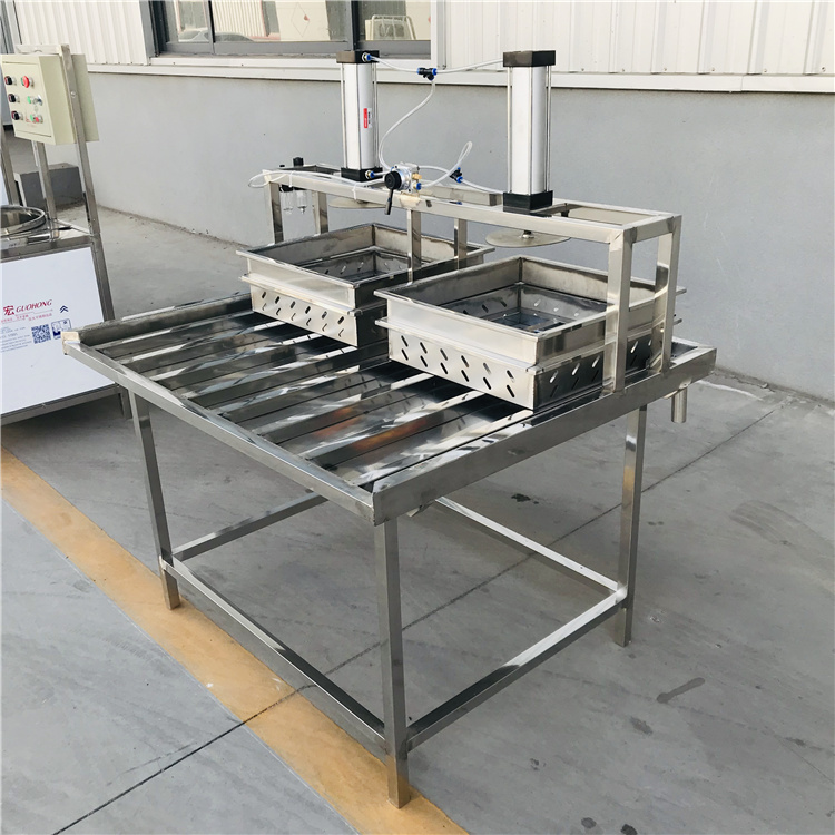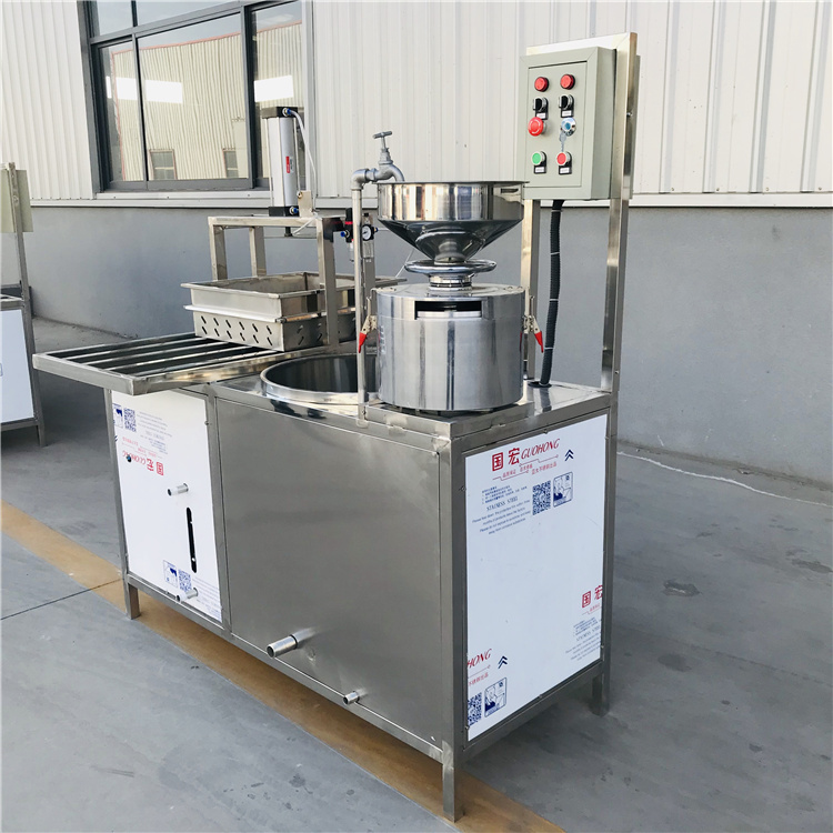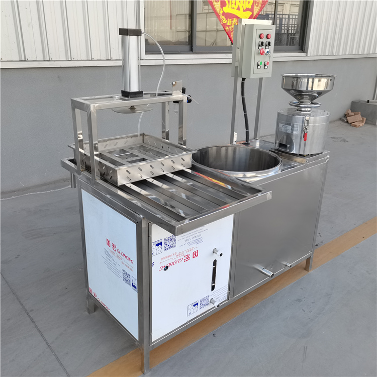 2、采用不锈钢制造,豆腐气压压制成型,干净卫生,符合绿色食用标准,机器占地面积小,省时省力,从原料投放到出成品仅需20-25分钟,还可以与其他设备和工艺配套生产更多的豆制品。